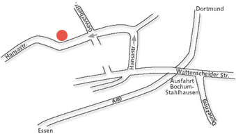 A40 - Ausfahrt Stahlhausen - abfahren Richtung Wattenscheid (nicht Bochum) - einbiegen in Hansastraße - nach ca. 2 km finden Sie uns auf der rechten Seite - Hansastraße 103
